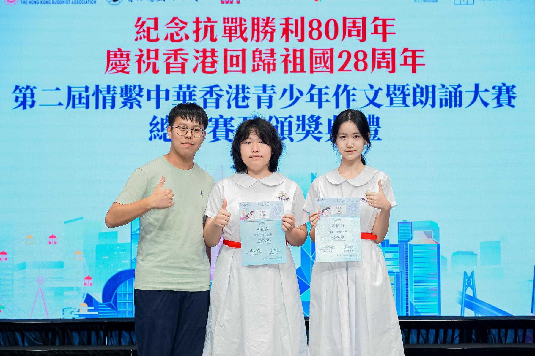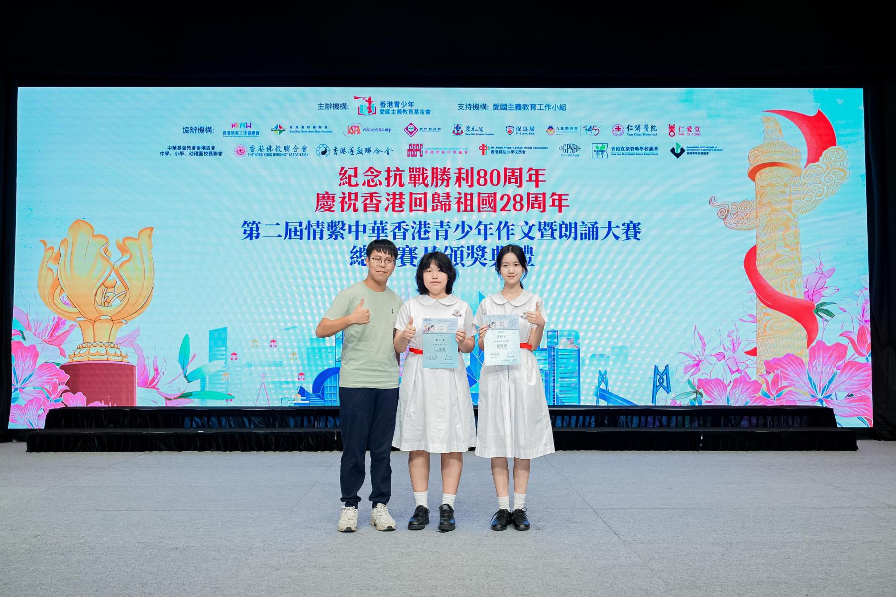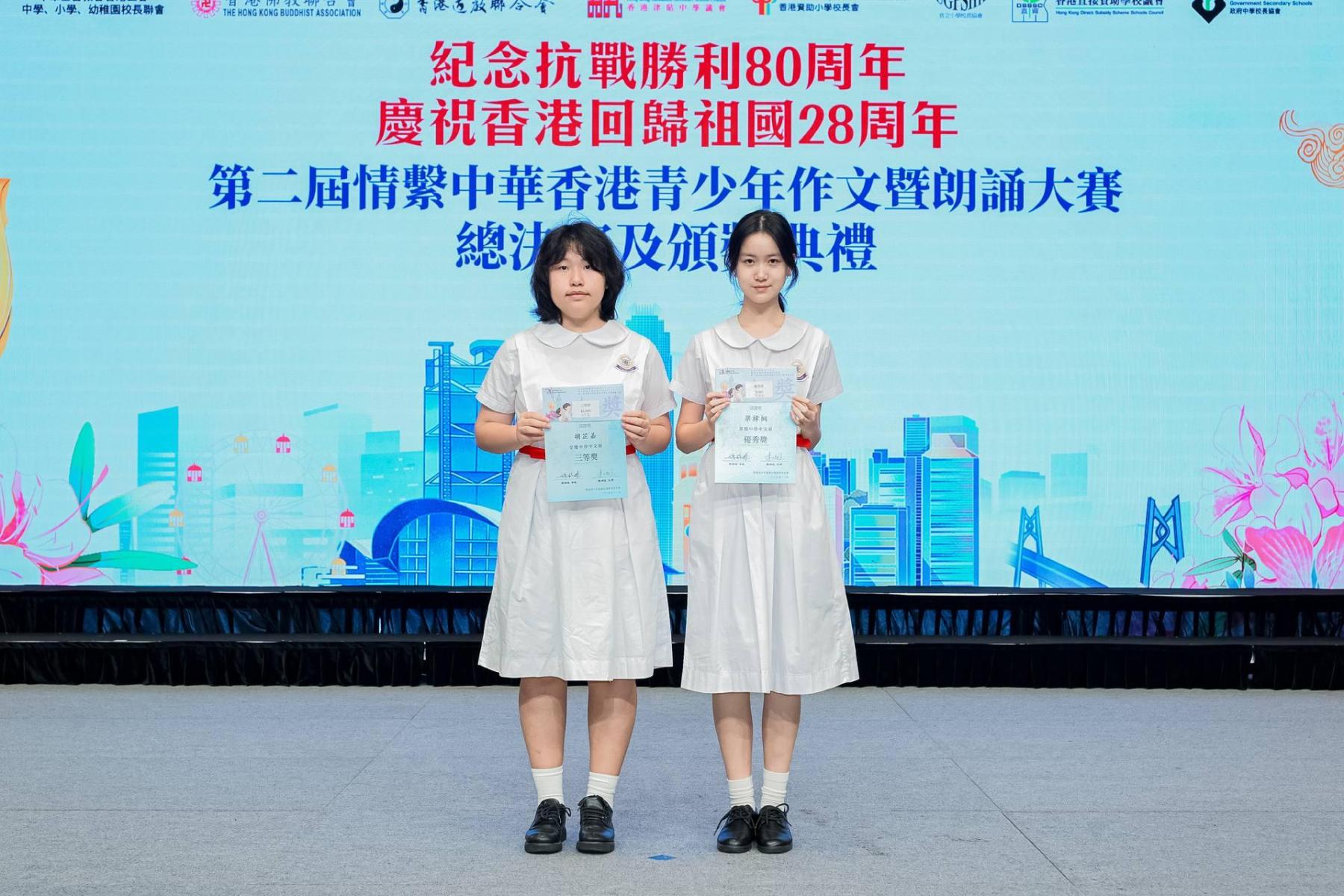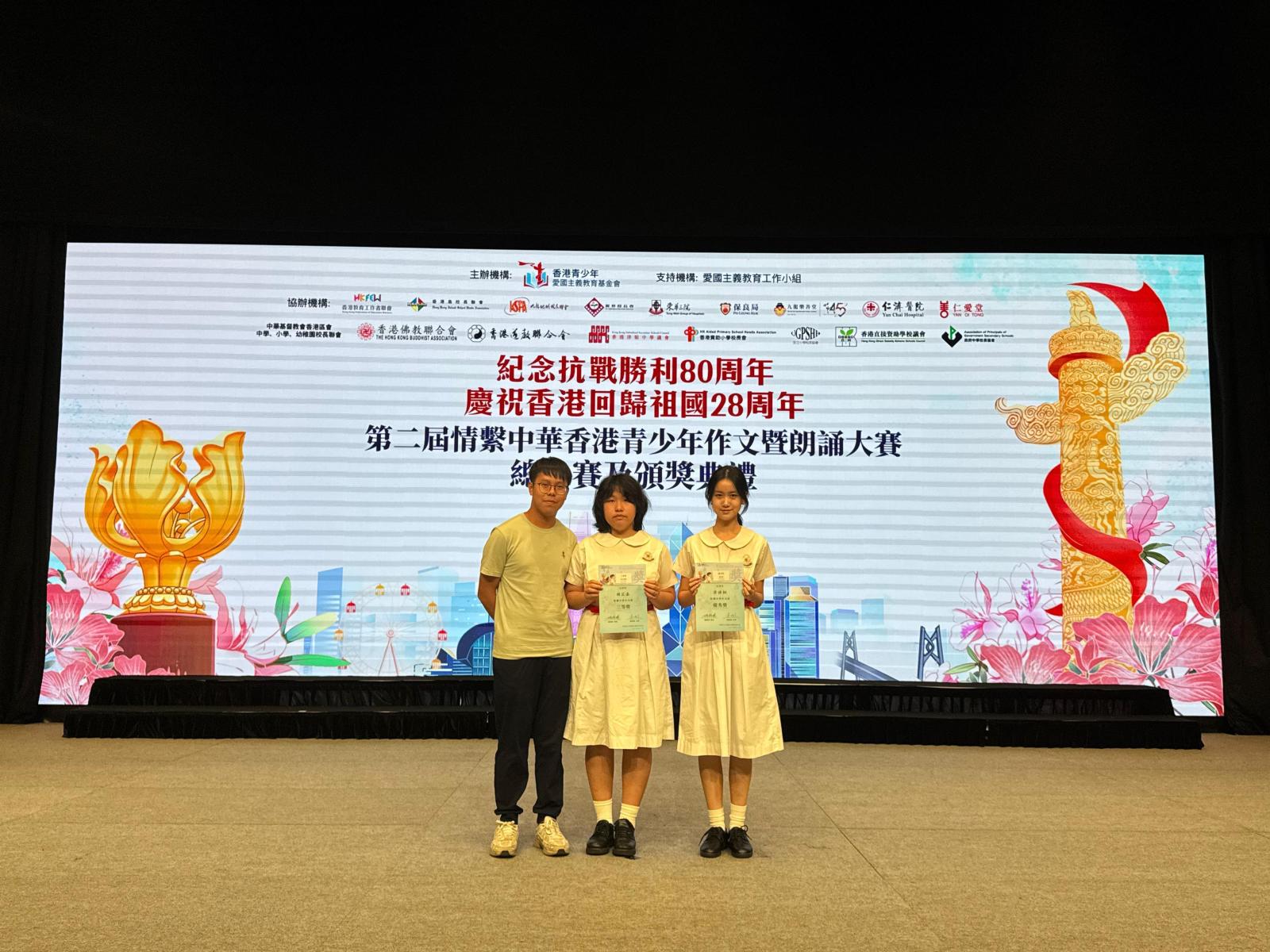 本校德育及公民教育委員會、世界歷史科、中國語文科合作,派出多位同學參加由香港愛國主義教育基金會主辦的第二屆情繫中華香港青少年作品暨朗誦大賽。本校兩位同學(3C胡芷嘉及6A班梁褘桐同學)分別獲大會頒發三等獎及優異獎,分別獲得1000元及500元現金以及證書作鼓勵。
